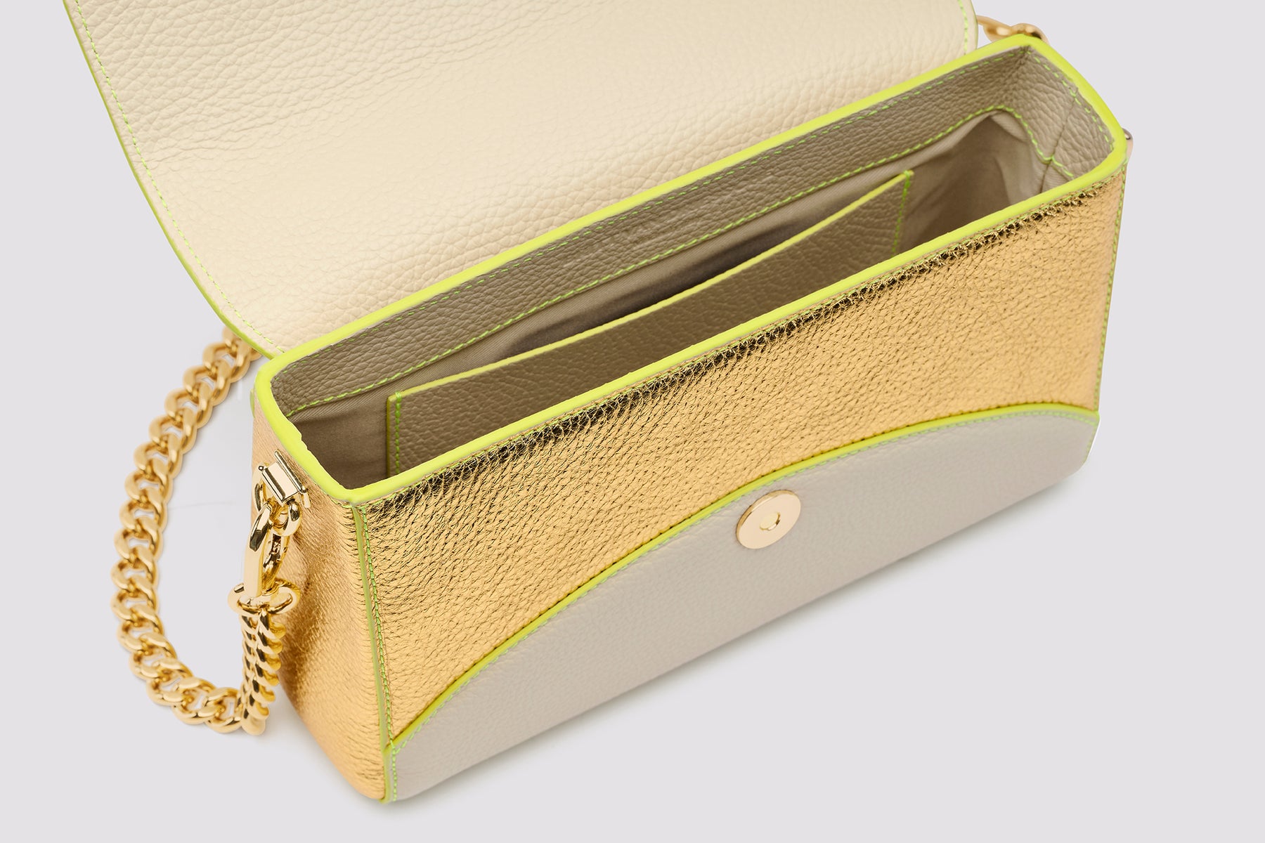 Clara komt van het Latijnse woord "clarus", wat stralend en schitterend betekent. Met deze verfijnde tas, in een neutrale kleur met neon en metallic accenten, schitter je zowel tijdens je dagelijkse bezigheden als tijdens een avondje uit. De Clara tas kan gedragen worden als clutch, crossbody dankzij de elegante verstelbare schouderband of met een luxe ketting voor een meer feestelijke look.