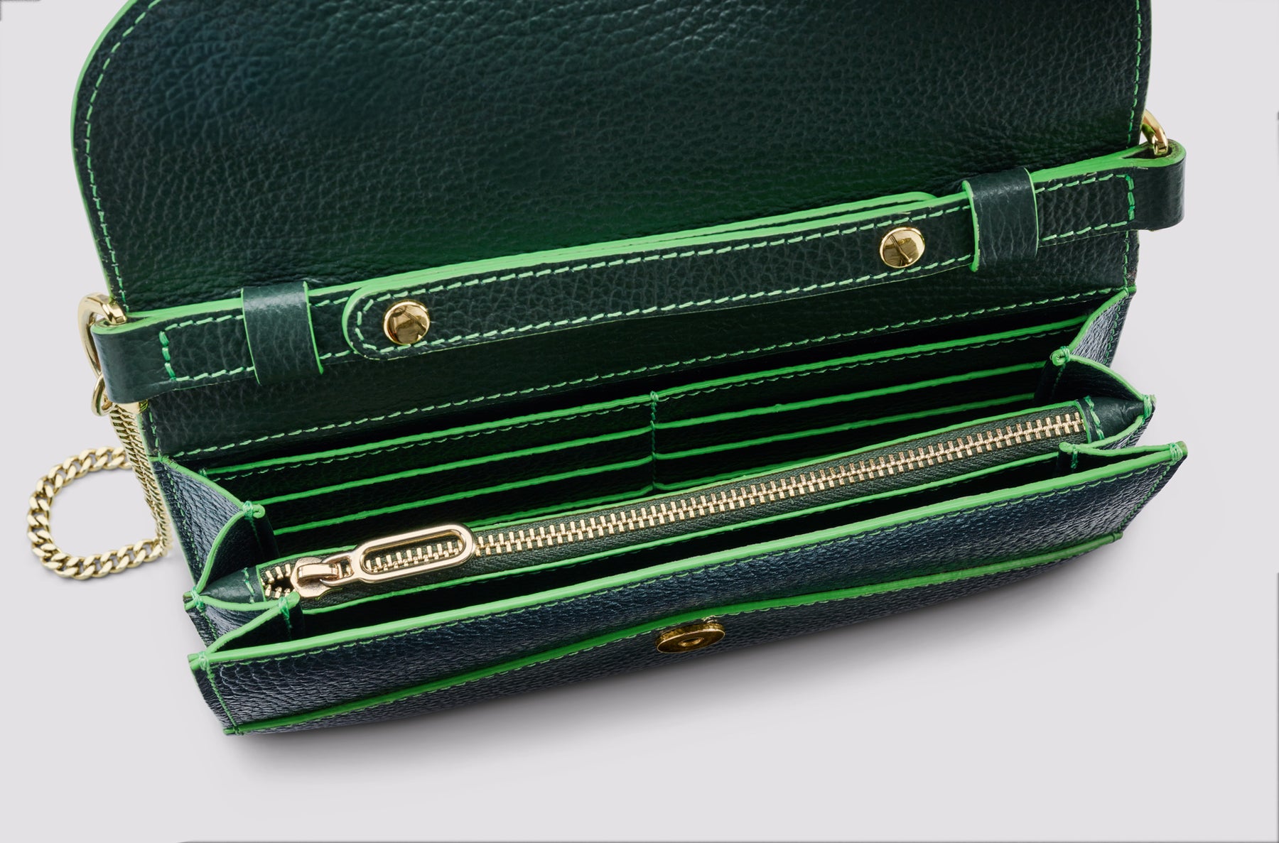 Helena symboliseert 'fakkel' en is uw ideale metgezel tijdens uw dagactiviteiten of een avondje uit. Deze complete portemonnee combineert prachtig met onze grotere tassen, maar is ook prachtig op zichzelf als clutch, riem of crossbody tas met de verstelbare leren band of gouden ketting.